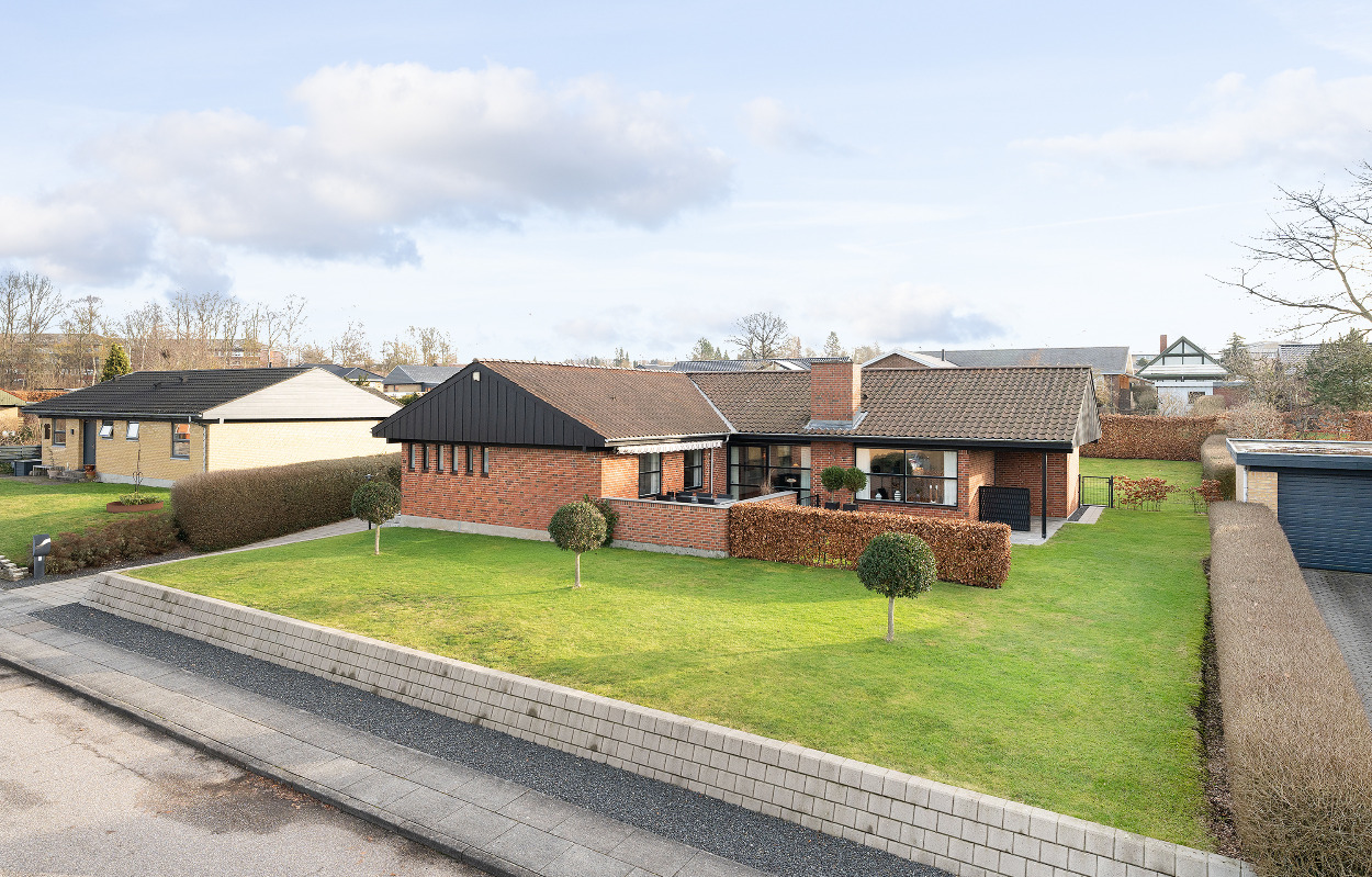 I forlængelse heraf ses den vedligeholdelsesvenlige plæne med robotplæneklipper, den praktiske garage samt de omkransende terrasser, hvorfra I kan til- og fravælge sol og skygge alt efter behov.