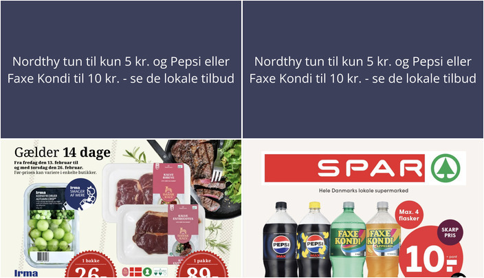 Hos Spar kan du få flere varianter af Pepsi eller Faxe Kondi til kun 10 kr. pr. flaske (1,5 liter). Bemærk, at der er en begrænsning på 4 flasker pr. kunde pr. dag. Tilbuddet gælder fra fredag den 13. februar til og med torsdag den 19. februar 2026.